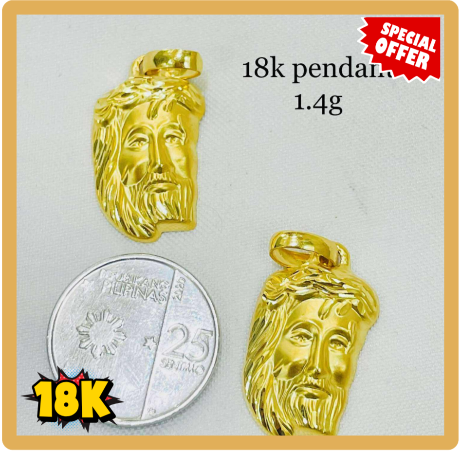 🔸 Material: 18K Saudi Gold (legit, tested, with complete papers) 🔸 Design: Mukha ni Cristo engraving, open back/hollow type 🔸 Size: Approx. [insert mm/inches] 🔸 Weight: [insert grams] 🔸 Inclusions: Pendant only (walang kasamang chain)